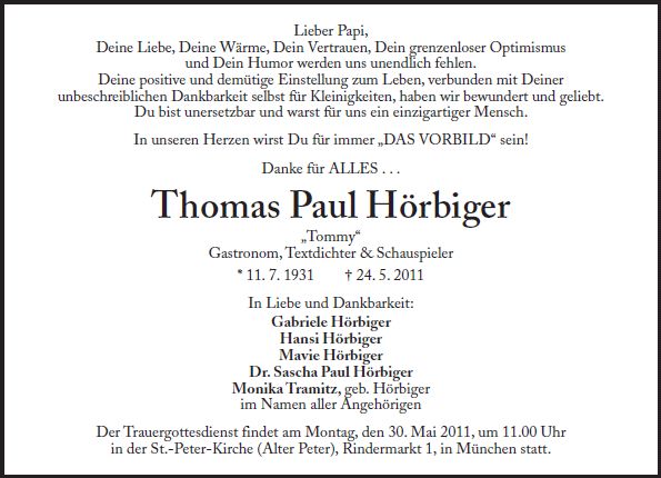 Wir trauern um Herrn Thomas Hörbiger Gastronom, Liedtexter & Schauspieler * 11.07.1931 † 24.05.2011 |
