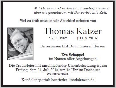 Die Trauerfeier mit anschließender Urnenbeisetzung ist am Freitag, dem 24. Juli 2015, um 15 Uhr im Waldfriedhof Dachau. |