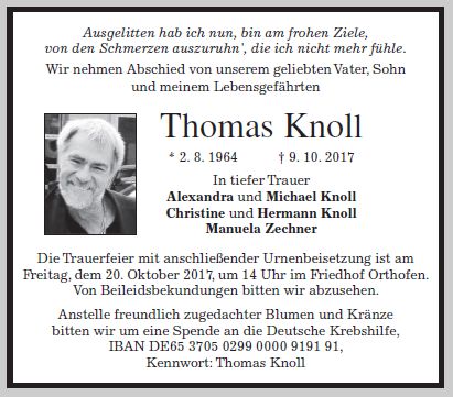 Wir trauern um Herrn Thomas Knoll Kfz-Mechanikermeister * 02.08.1964 † 09.10.2017 |