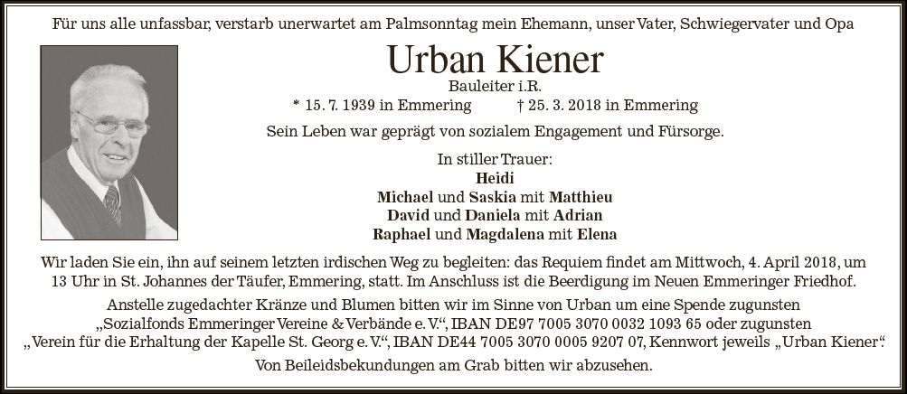 Der Gottesdienst findet am Mittwoch, 4.4.2018 um 13 Uhr in St. Johannes der Täufer, Emmering statt. Die Beerdigung ist im Anschluss im Neuen Friedhof in Emmering.