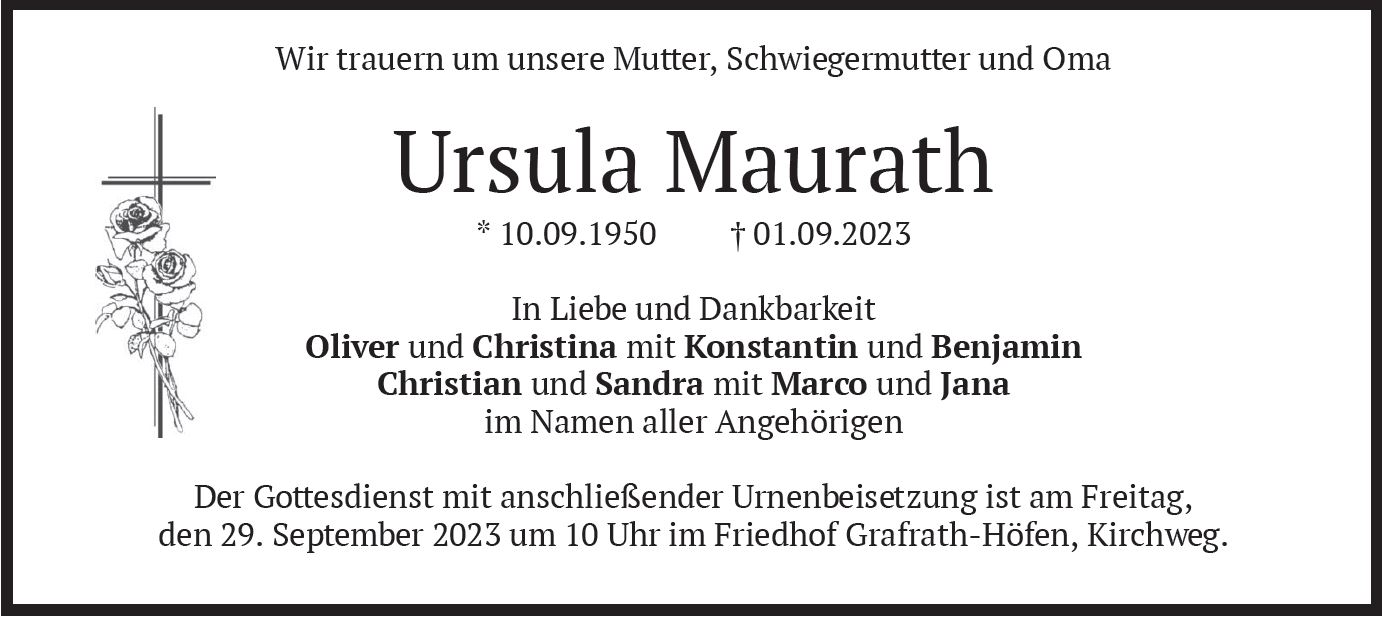 Der Gottesdienst mit anschließender Urnenbeisetzung ist am Freitag, den 29. September 2023 um 10 Uhr im Friedhof Grafrath-Höfen, Kirchweg.