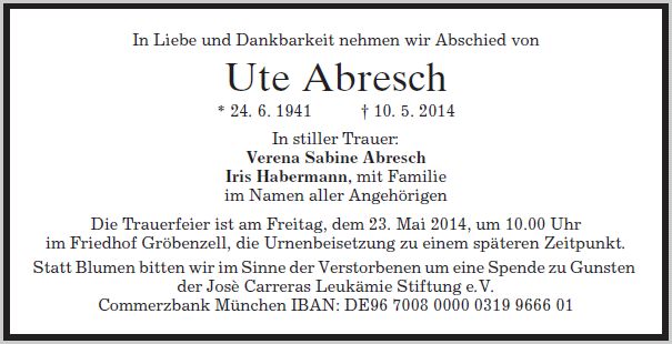 Die Trauerfeier ist am Freitag, dem 23. Mai 2014, um 10:00 Uhr im Friedhof Gröbenzell Die Urnenbeisetzung findet zu einem späteren Zeitpunkt statt.