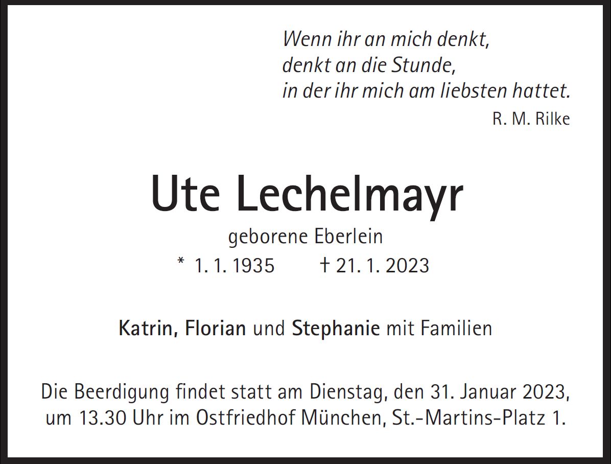 Wir trauern um Frau Ute Lechelmayr geb. Eberlein Bankkauffrau * 01.01.1935 † 21.01.2023 |