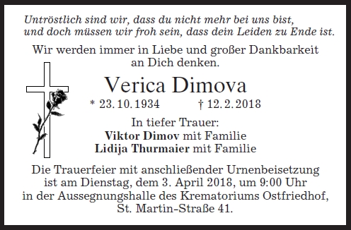Wir trauern um Frau Verica Dimova Hausfrau * 23.10.1934 † 12.02.2018 |