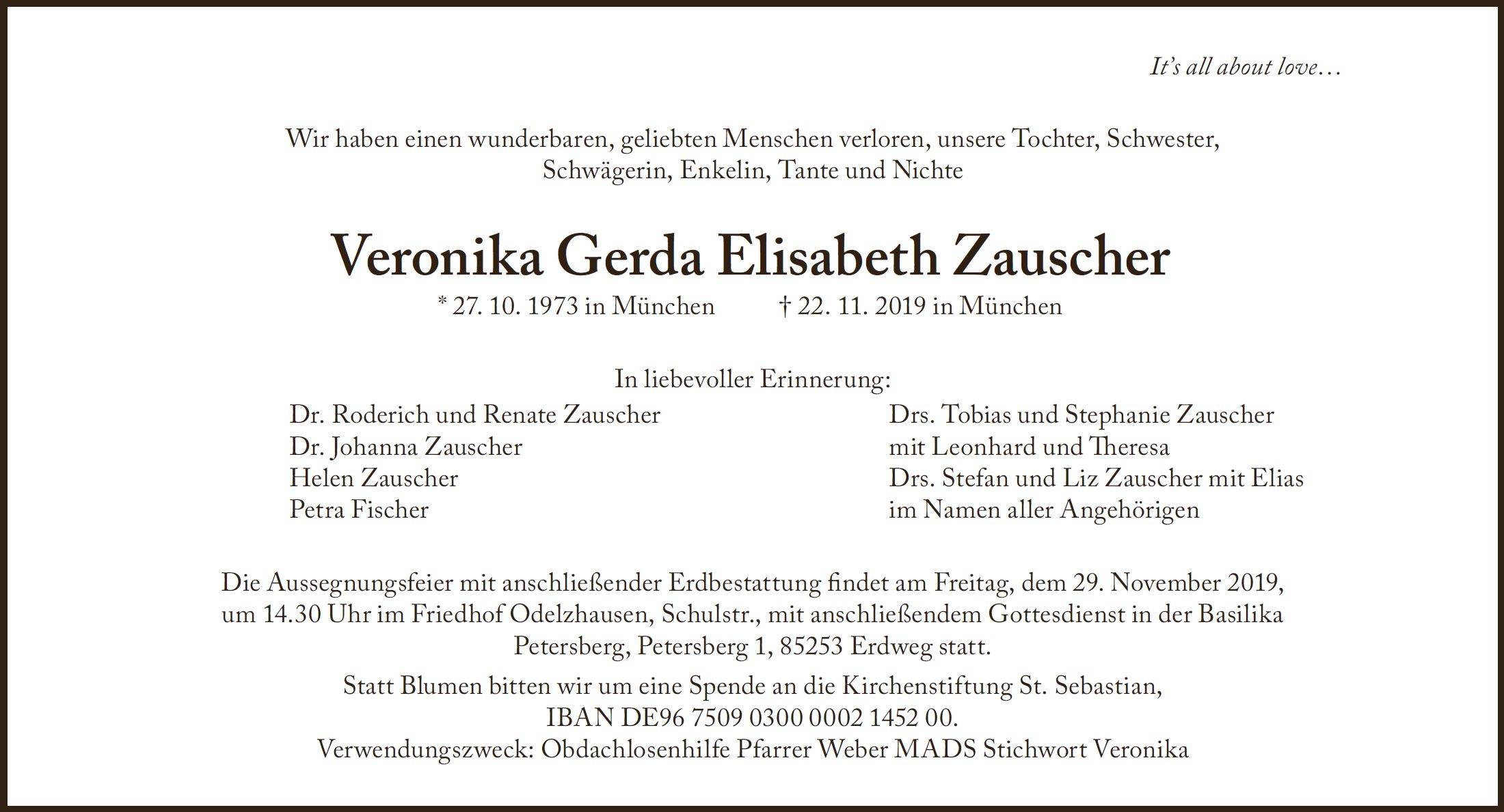 Gottesdienst am Freitag, dem 29. November 2019, um 16:00 Uhr in der Basilika Petersberg. Beerdigung am Freitag, dem 29. November 2019, um 14:30 Uhr im Friedhof Odelzhausen.