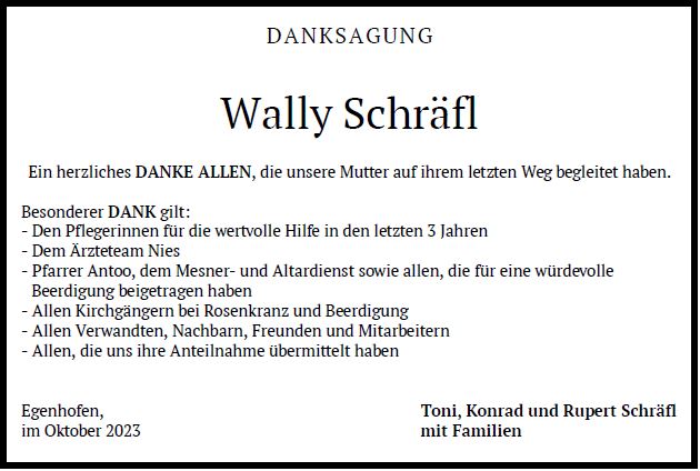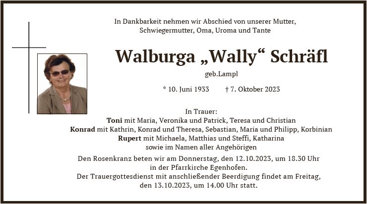 Wir trauern um Frau Walburga Schräfl geb. Lampl * 10.06.1933 † 07.10.2023 |