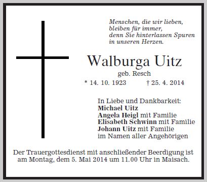 Gottesdienst am Montag, dem 5. Mai 2014, um 11:00 Uhr in St. Vitus Maisach, anschließende Beerdigung am Kirchenfriedhof.