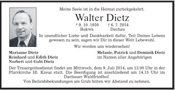 Der Gottesdienst ist am Mittwoch, dem 9. Juli 2014, um 13 Uhr in Heilig Kreuz. Die Beerdigung ist anschließend um 14:15 Uhr im Dachauer Waldfriedhof.