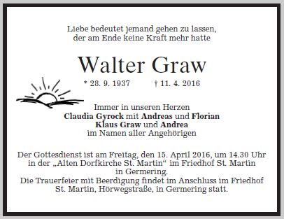 Wir trauern um Herrn Walter Graw * 28.09.1937 † 11.04.2016 |