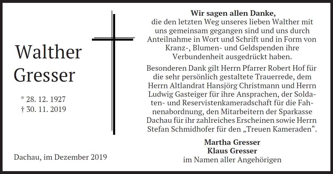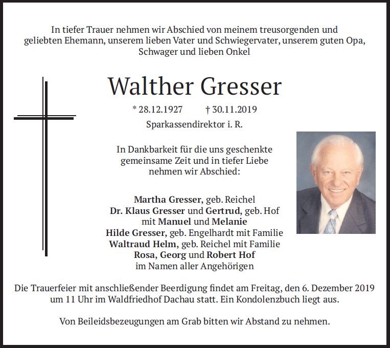 Wir trauern um Herrn Walther Gresser Sparkassendirektor i.R. * 28.12.1927 † 30.11.2019 |