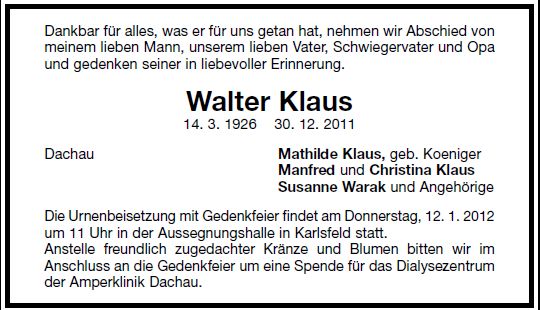 Die Gedenkfeier mit anschließender Urnenbeisetzung ist am Donnerstag, dem 12. Januar 2012, um 11:00 Uhr in der Aussegnungshalle Karlsfeld. |