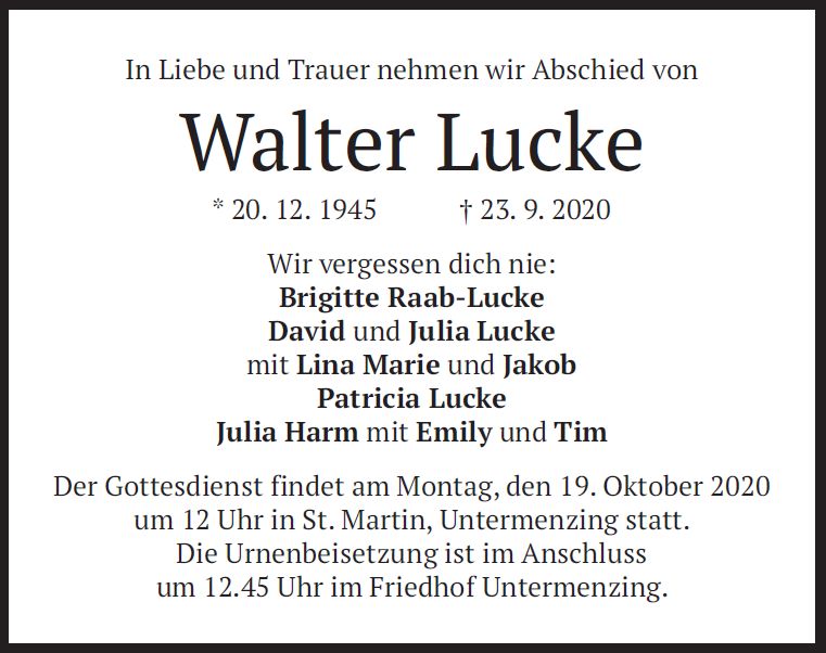 Wir trauern um Herrn Walter Lucke * 20.12.1945 † 23.09.2020 |