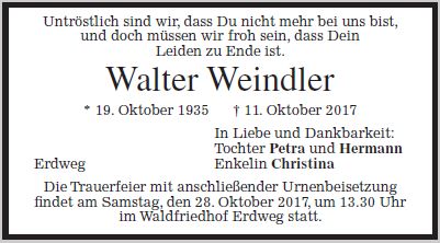 Die Trauerfeier mit anschließender Urnenbeisetzung ist am 28.10.2017 um 13:30 Uhr im Waldfriedhof in Erdweg.