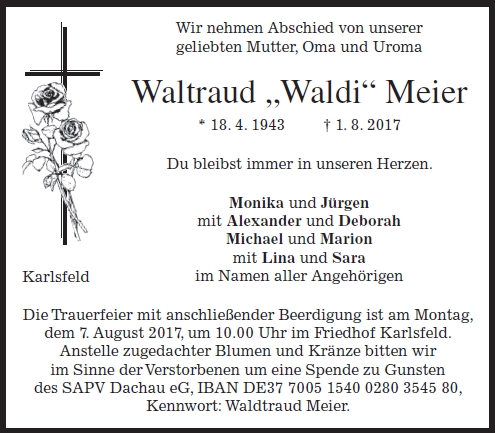 dem 7. August 2017, um 10.00 Uhr im Friedhof Karlsfeld. |