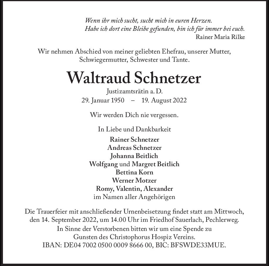 Wir trauern um Frau Waltraud Schnetzer geb. Urban Justizamtsrätin a.D. * 29.01.1950 † 19.08.2022 |