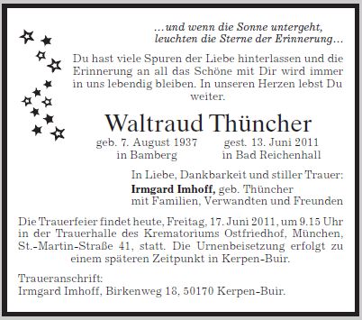 Die Trauerfeier ist am Freitag, dem 17. Juni 2011, um 09:15 Uhr im Krematorium München, St. Martin Straße 41, die Urnenbeisetzung zu einem späteren Zeitpunkt in Kerpen-Buir |