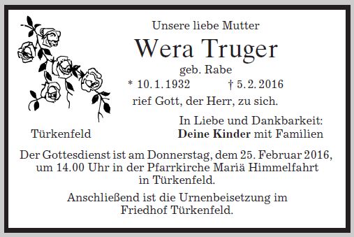 Wir trauern um Frau Wera Truger geb. Rabe * 10.01.1932 † 05.02.2016 |