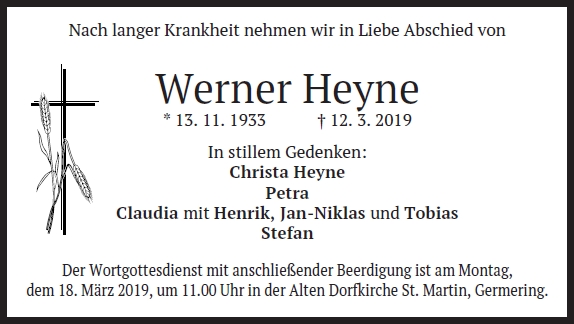 Der Wortgottesdienst mit anschließender Beerdigung ist am Montag,dem 18. März 2019, um 11.00 Uhr in der alten Dorfkirche St. Martin, Germering. |