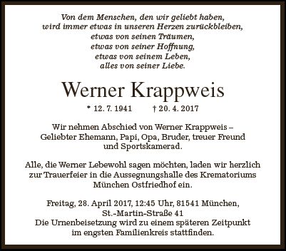 Trauerfeier am Freitag, den 28. April 2017, um 12:45 Uhr im Münchner Krematorium