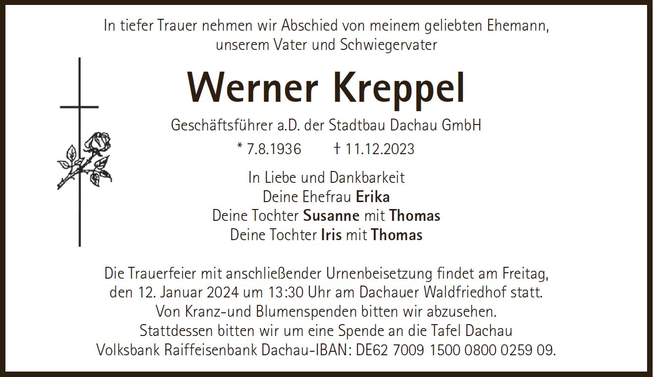 Wir trauern um Herrn Werner Kreppel Geschäftsführer a.D. der Stadtbau Dachau GmbH * 07.08.1936 † 11.12.2023 |