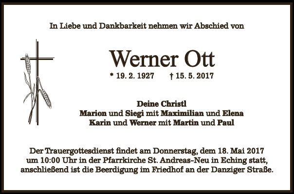 Gottesdienst am Donnerstag, dem 18. Mai 2017, um 10:00 Uhr in St. Andreas-Neu in Eching Anschließend Beerdigung im Friedhof Eching an der Danziger Straße