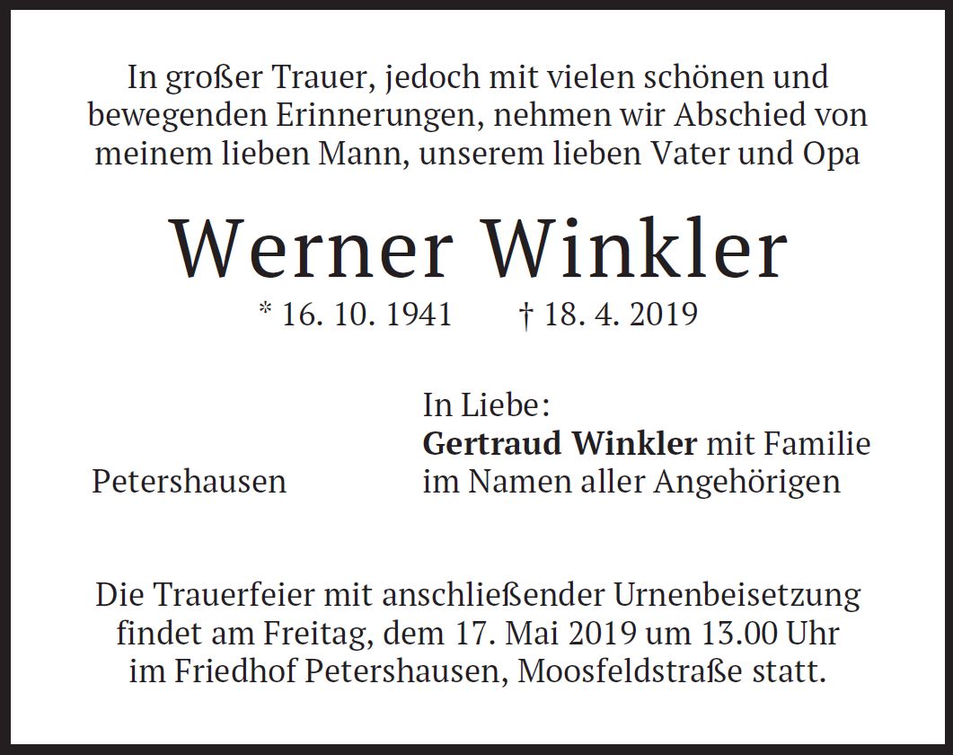 Trauerfeier mit anschließender Urnenbeiseetzung am Freitag, dem 17. Mai 2019, um 13:00 Uhr im Friedhof Petershausen, Moosfeldstr.