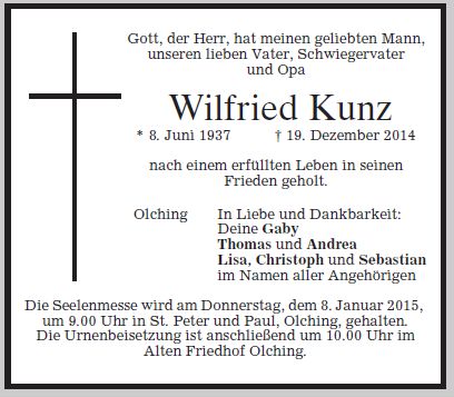 Gottesdienst am Donnerstag, dem 8. Januar 2015, um 9 Uhr in St. Peter und Paul, Olching. Beisetzung anschließend um 10 Uhr in Olching, Alter Friedhof.