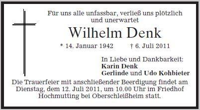 Die Trauerfeier mit anschließender Beerdigung findet am Dienstag,dem 12.7.2011 um 10:00 Uhr im Friedhof Hochmutting statt.