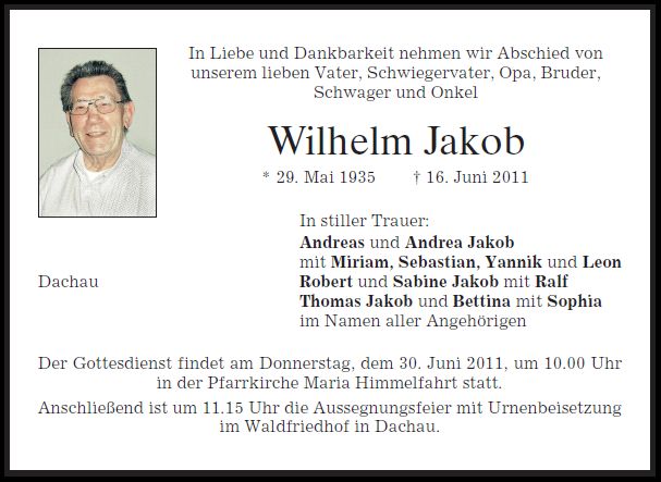 Gottesdienst am Donnerstag, dem 30. Juni 2011, um 10:00 Uhr in Maria Himmelfahrt Trauerfeier am Donnerstag, dem 30. Juni 2011, um 11:15 Uhr im Dachau Waldfriedhof mit anschließender Urnenbeisetzung