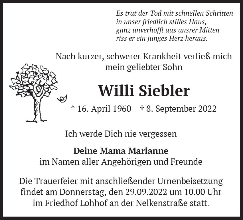 Wir trauern um Herrn Wilhelm Siebler * 16.04.1960 † 08.09.2022 |
