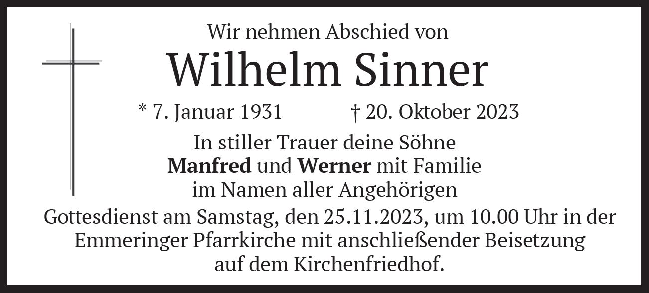Wir trauern um Herrn Wilhelm Sinner * 07.01.1931 † 20.10.2023 |