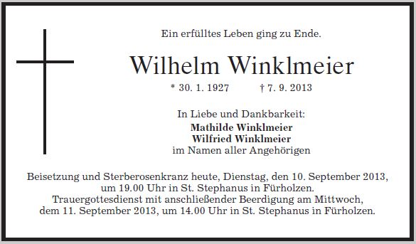 Gottesdienst mit anschließender Beerdigung am Mittwoch, dem 11. September 2013, um 14:00 Uhr in St. Stephan , Fürholzen