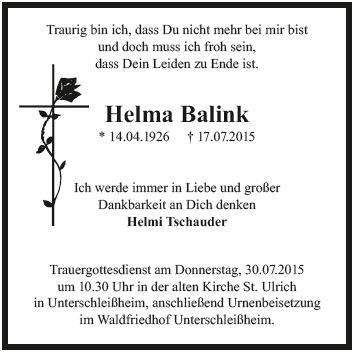 Trauerfeier am Donnerstag, dem 30. Juli 2015, um 10:30 Uhr in St. Ulrich - Alt in Unterschleißheim Beisetzung am Donnerstag, dem 30. Juli 2015, um 11:30 Uhr im Waldfriedhof Unterschleißheim
