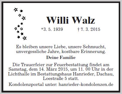 Trauerfeier am Samstag, dem 14. März 2015, um 11:00 Uhr in der Lichthalle im Bestattungshaus Hanrieder
