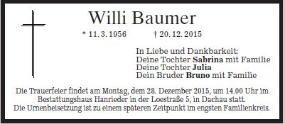 Wir trauern um Herrn Willibald Baumer Rentner * 11.03.1956 † 20.12.2015 |