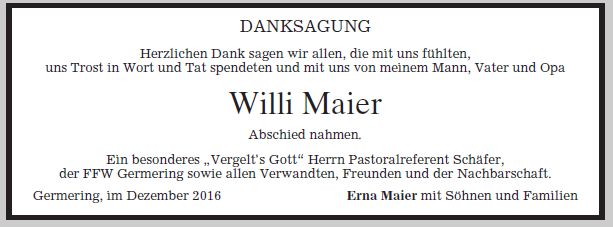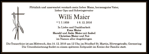 Die Trauerfeier zur Feuerbestattung ist am Mittwoch, den 14.12.2016 um 12 Uhr, im Friedhof St. Martin, Germering. Die Urnenbeisetzung findet zu einem späteren Termin im Kreise der Familie statt.