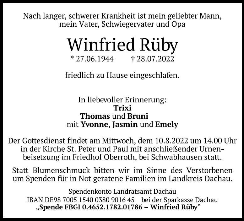 Gottesdienst am Mittwoch, dem 10. August 2022, um 14:00 Uhr in St. Peter und Paul, Oberroth. Beisetzung am Mittwoch, dem 10. August 2022, um 14:00 Uhr im Friedhof Oberroth.