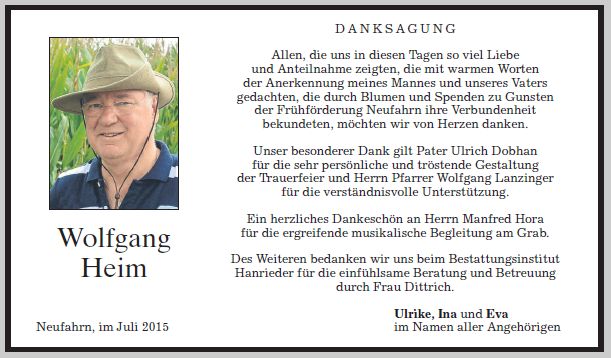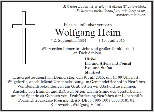 Gottesdienst am Donnerstag, dem 9. Juli 2015, um 14:00 Uhr in St. Wilgefortis in Neufahrn Anschließend Urnenbeisetzung im Gemeindefriedhof Neufahrn