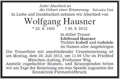 Die Trauerfeier mit anschließender Urnenbeisetzung ist am Montag, dem 30.7.2012 um 11:00 Uhr in der Aussegnungshalle im Friedhof München Aubing, Freihamer Weg. |