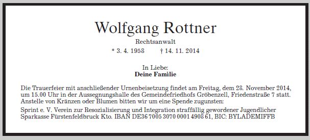Trauerfeier am Freitag, dem 28. November 2014, um 15:00 Uhr im Gröbenzell Beisetzung am Freitag, dem 28. November 2014, um 15:30 Uhr im Gröbenzell